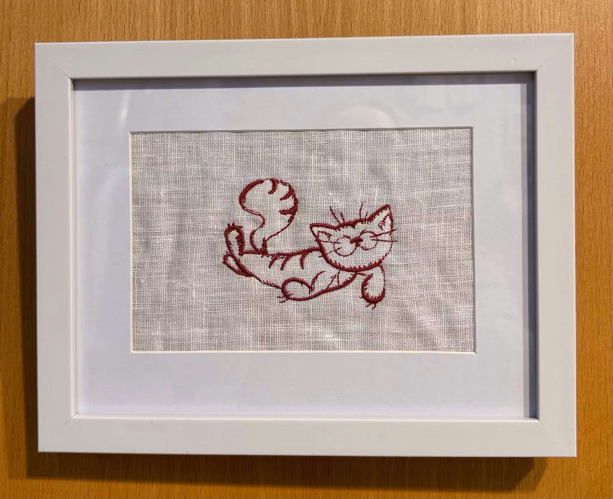 Broderad tavla med söt katt som ligger ner. 225 kr En gullig liggande katt, maskinbroderad på vitt linne och inramad i ram med glas.Storlek 13x18cm I lager Lägg i korgen Artikelnummer: 188 Dela Information Recensioner En gullig liggande katt, maskinbroderad på vitt linne och inramad i ram med glas.Storlek 13x18cm
