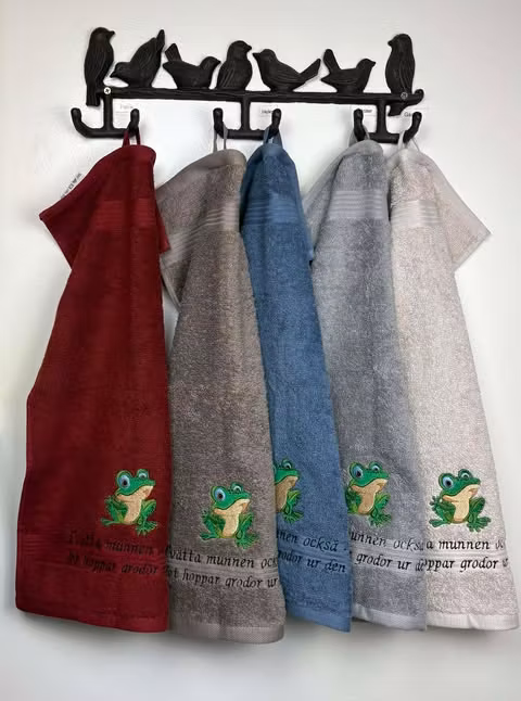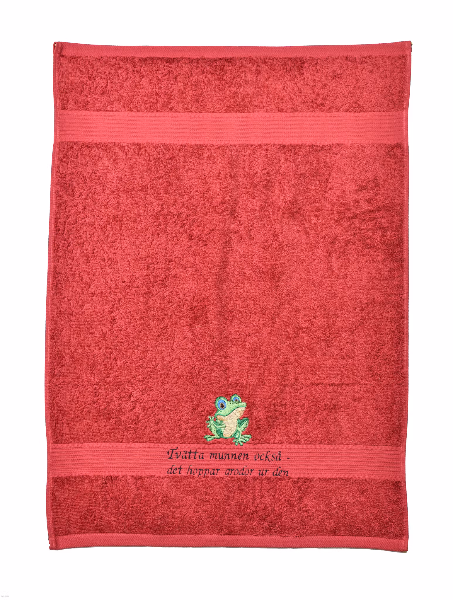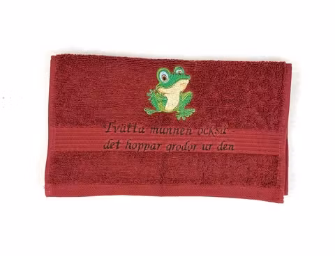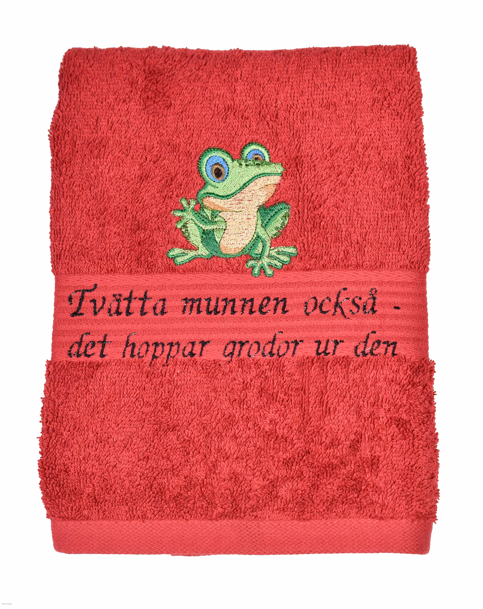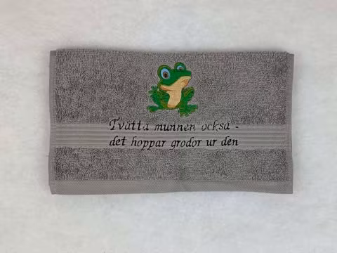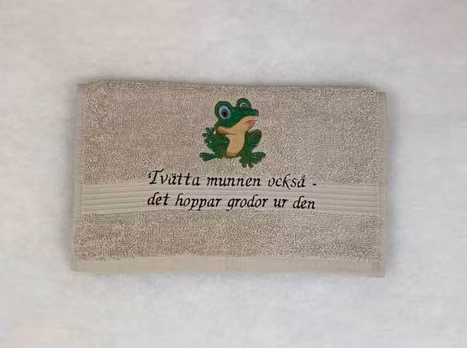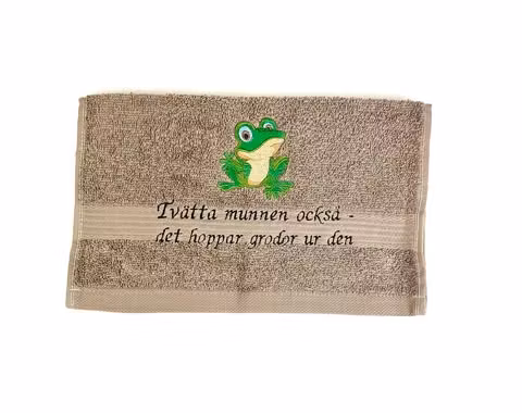 Gästhandduk med broderad groda och texten: "Tvätta munnen också - det hoppar grodor ur den"