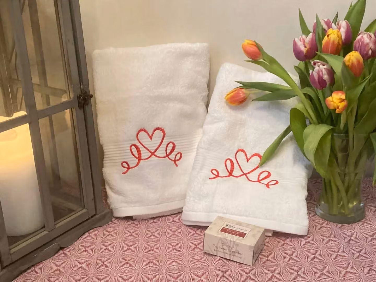 Handduk med broderat hjärta.